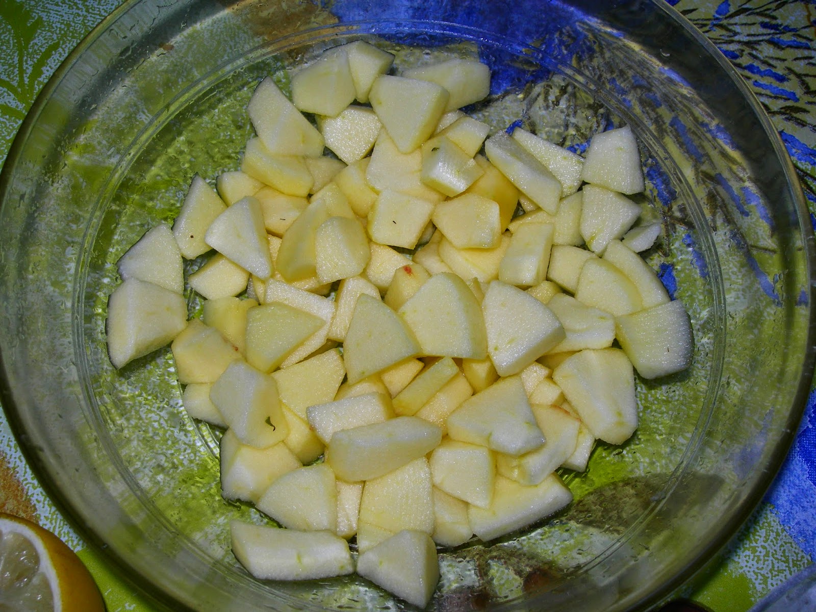 Почистить яблоки от шкурки. Порезать 2 яблока кубиками, а 1 дольками (для украшения). Полить их лимонным соком и отставить в сторону.