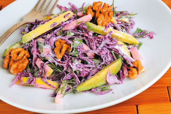 На 3 персоны: капуста краснокочанная — 400 г, авокадо — 1 шт., орехи грецкие — 100 г, яблоки — 1 шт., сметана (майонез) — 50 г, соль