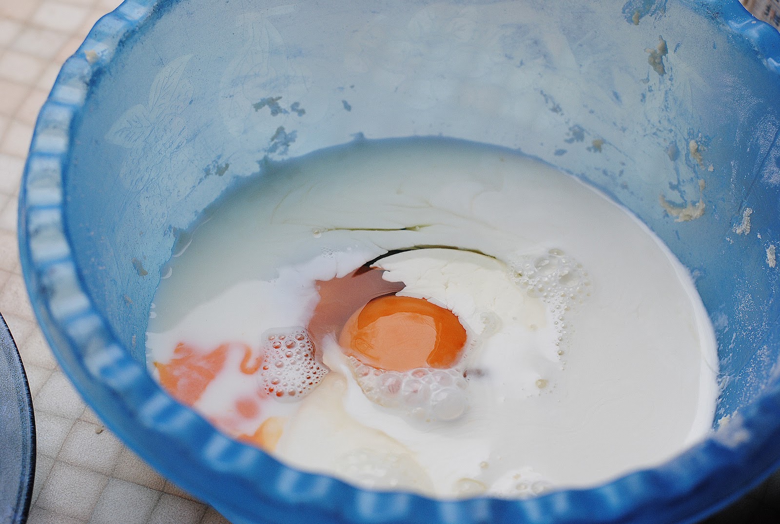 4)Яйца ,молоко и сливки взбить венчиком до однородности.