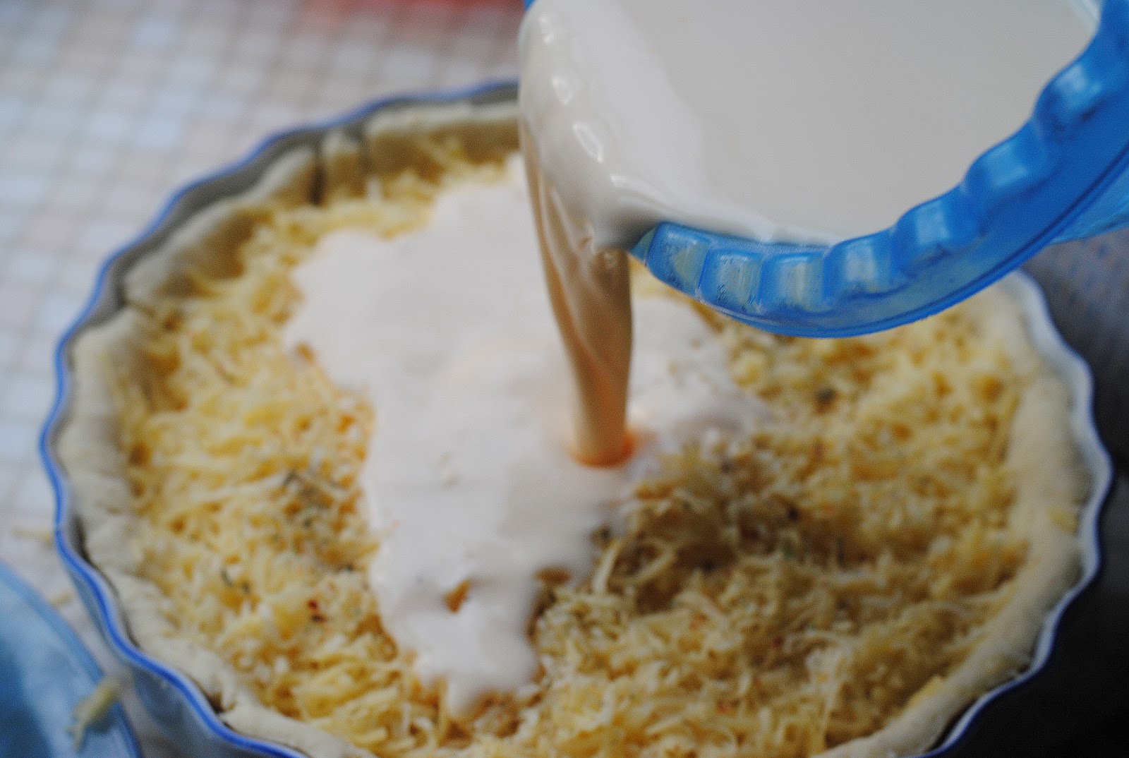 5)На готовое тесто выложить сыр ,посыпать приправами и залить яично-молочной смесью.