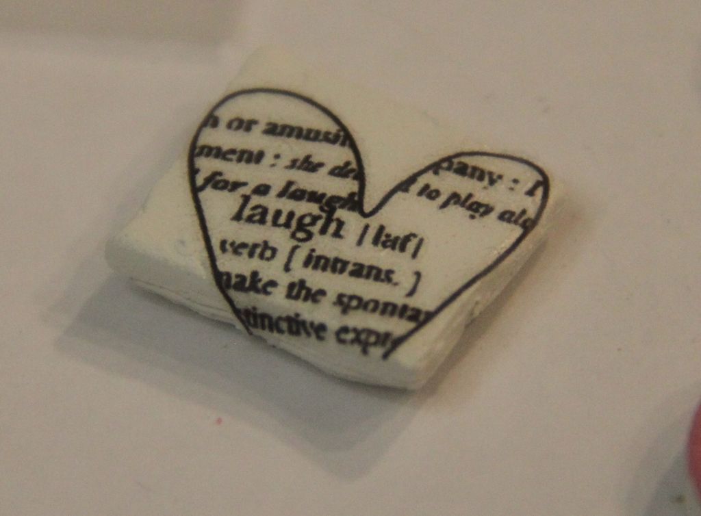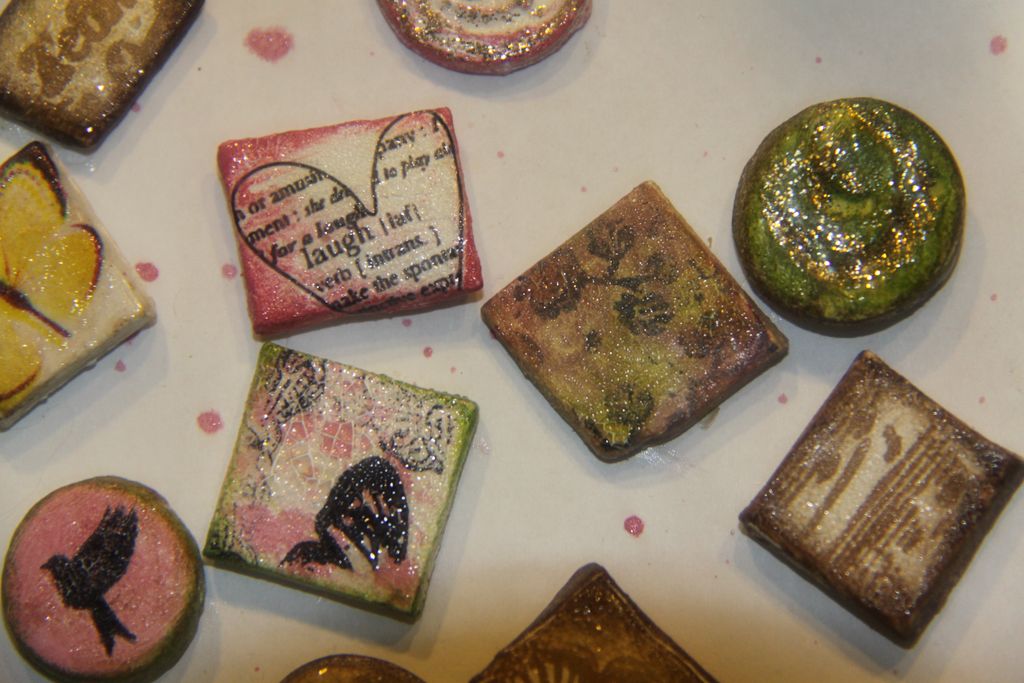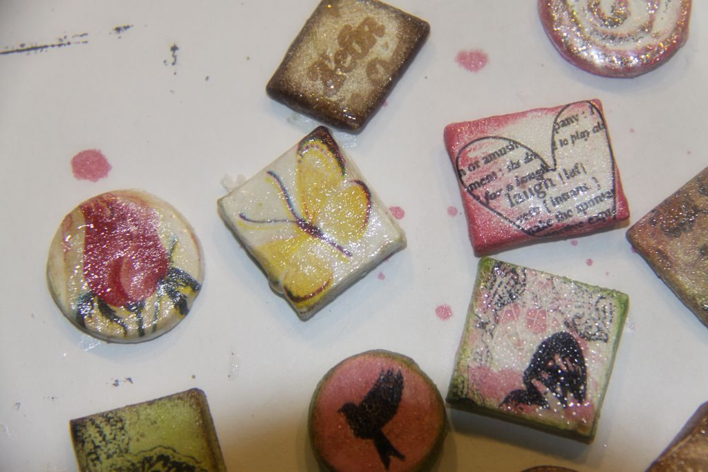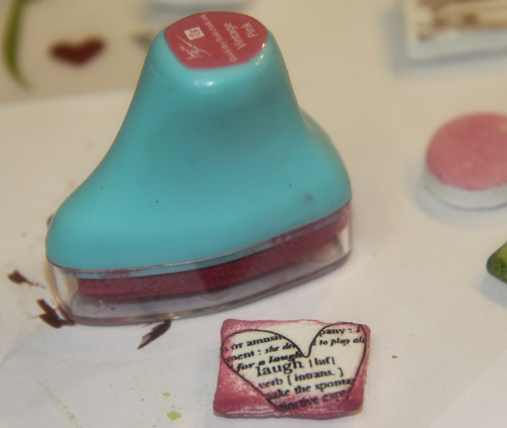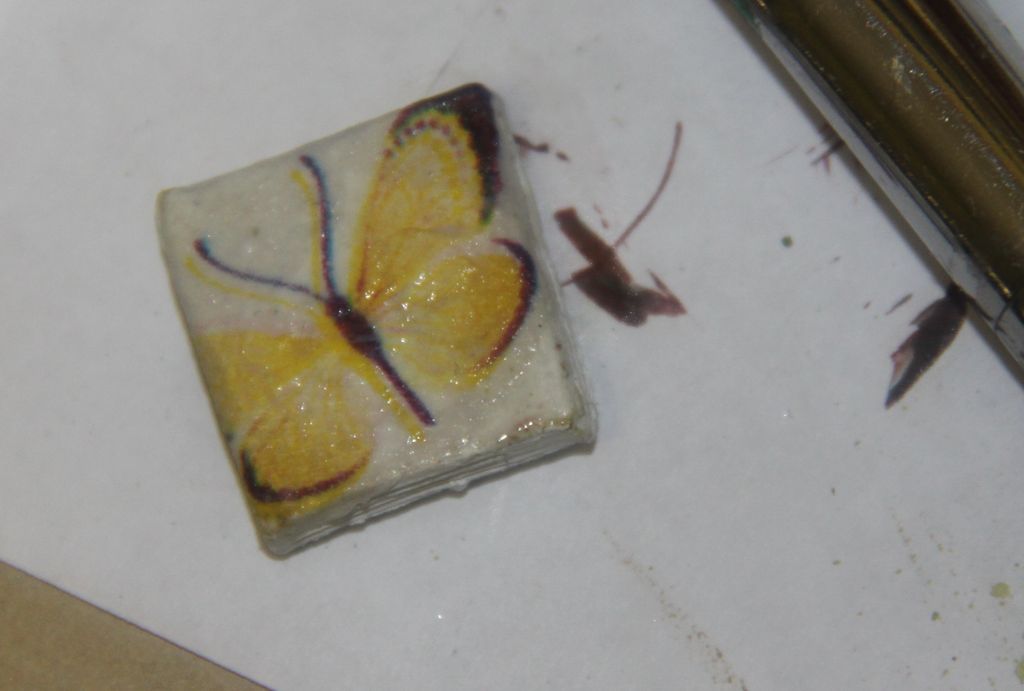 Берем силиконовый или резиновый штамп с некрупным рисунком, например: бабочка, маленькая птичка, короткое слово типо "тебя", "тебе", "мы" и т.д., цветочек, завитушка и т.д., на блок не прицепляем, а макаем нужный фрагмент штампа в чернильную подушечку и ставим оттиск на плиточке.