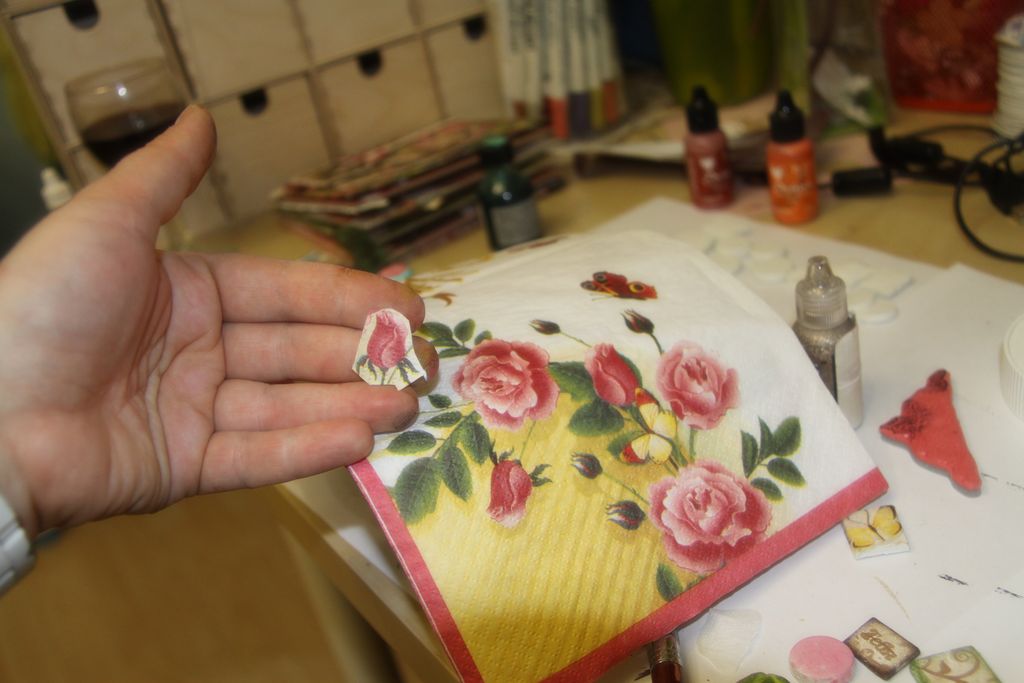 Берем красивую салфетку с наличием мелкого рисунка, выбираем рисунок нужного нам размера - бабочка, цветочек, и др. и выстригаем