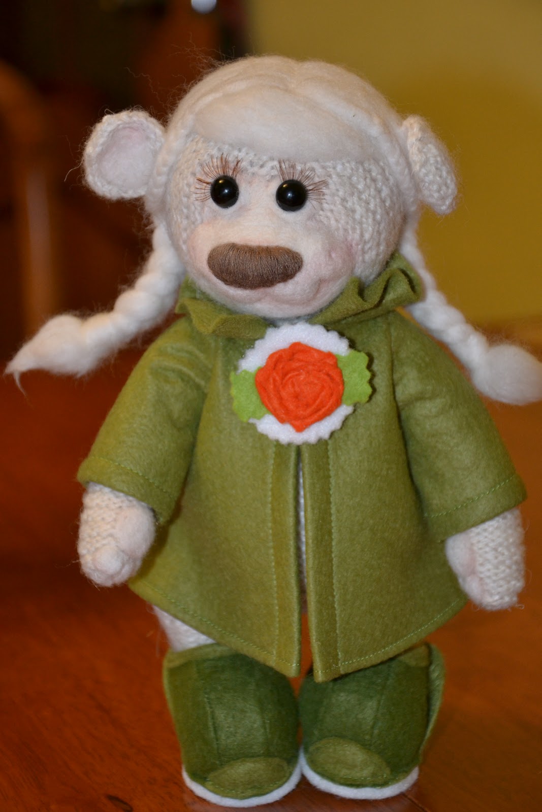 Ну вот и готово, в таких ботах медведики хорошо стоят без опоры. Одежки легко снимаются-одеваются.