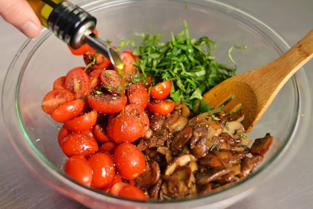 5. Перекладываем содержимое сковороды в глубокую миску и остужаем до комнатной температуры. Когда грибы остынут, добавляем в миску порезанные пополам помидоры черри, базилик, солим, перчим, заправляем бальзамическим уксусом и оливковым маслом. Тщательно перемешиваем.