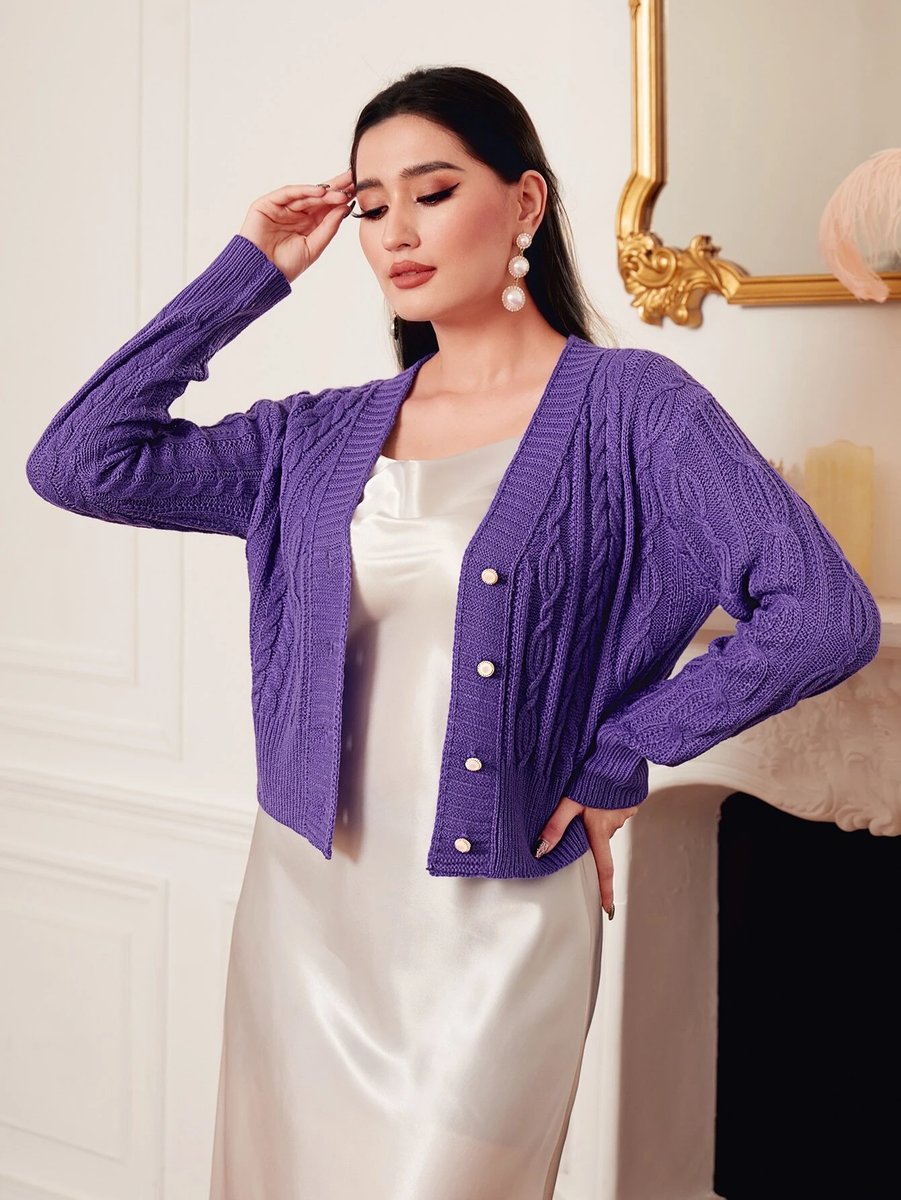 Седьмой укороченный кардиган - яркого и насыщенного фиолетового цвета с сочетанием нескольких аранов.