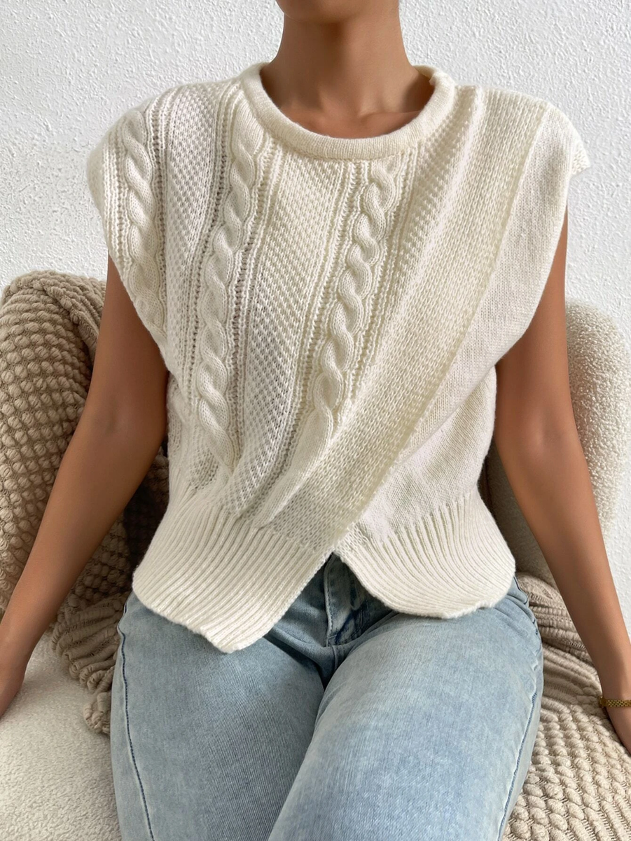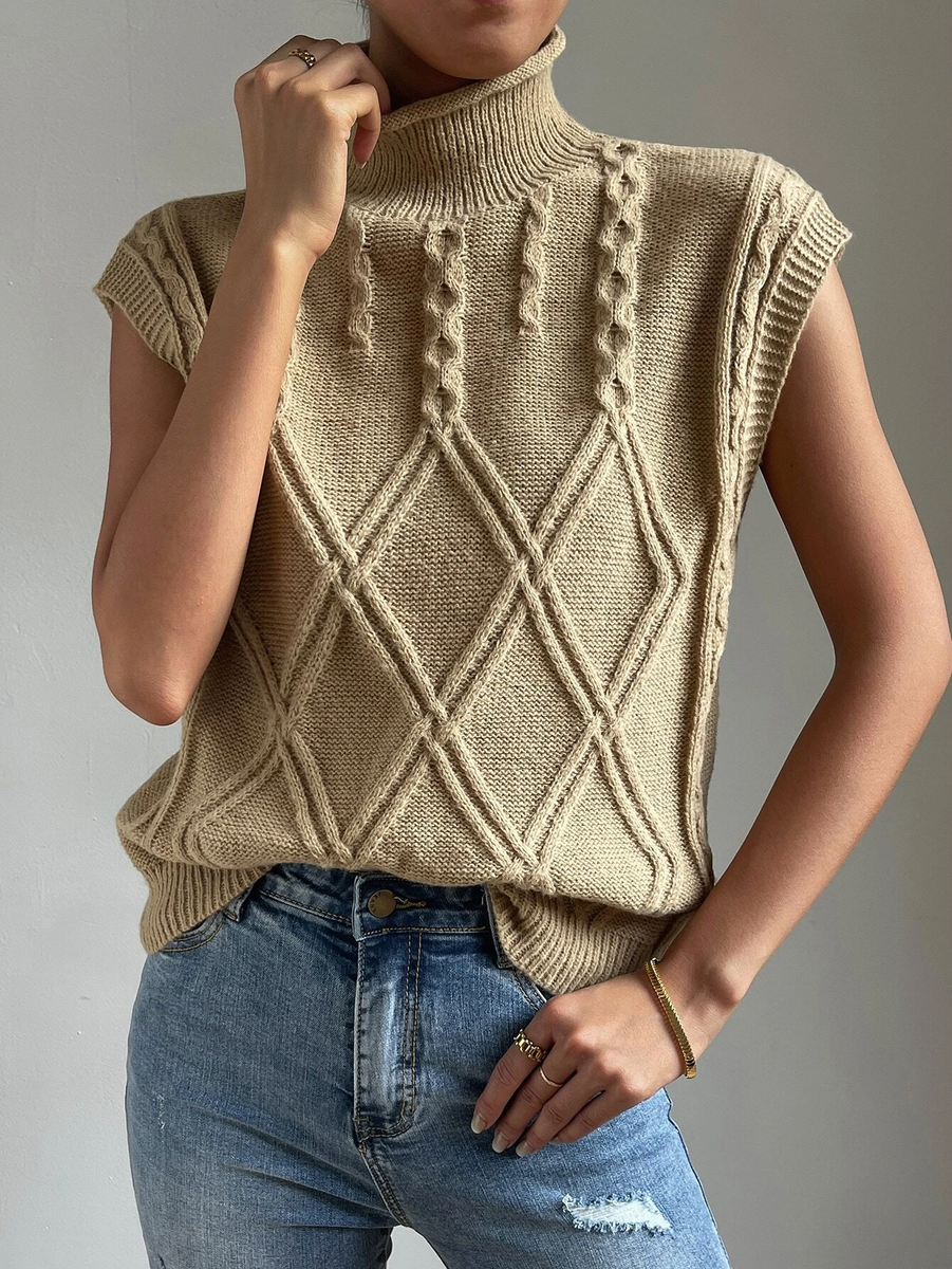 Вторая безрукавка связана узором из очень крупных двойных ромбов, которые в верхней части переходят в волнистые косы.