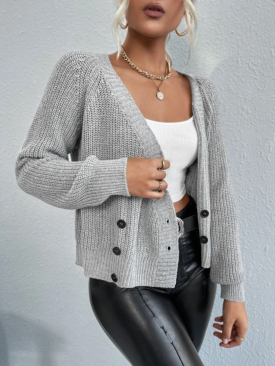Третий кардиган красивого серого цвета связан полупатентной резинкой. У модели рукав-реглан и ворот в виде V.