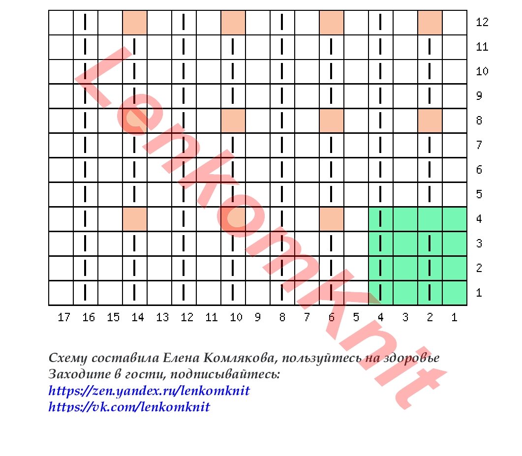 На рисунке - схема узора для лицевых и изнаночных рядов. Зеленым цветом выделен простенький раппорт узора, а розовым отмечены для удобства изнаночные петли на полосах лицевой глади. Пустые клетки на схеме = изнаночные петли.
