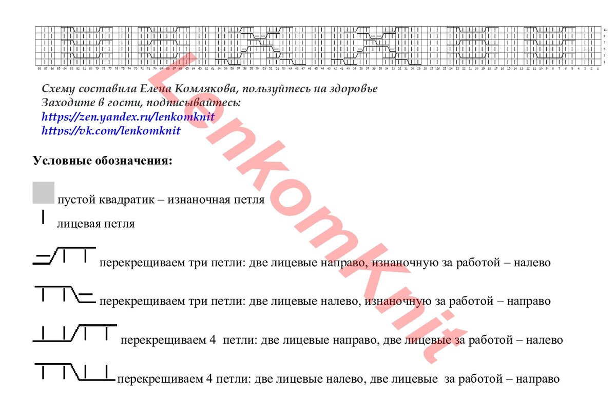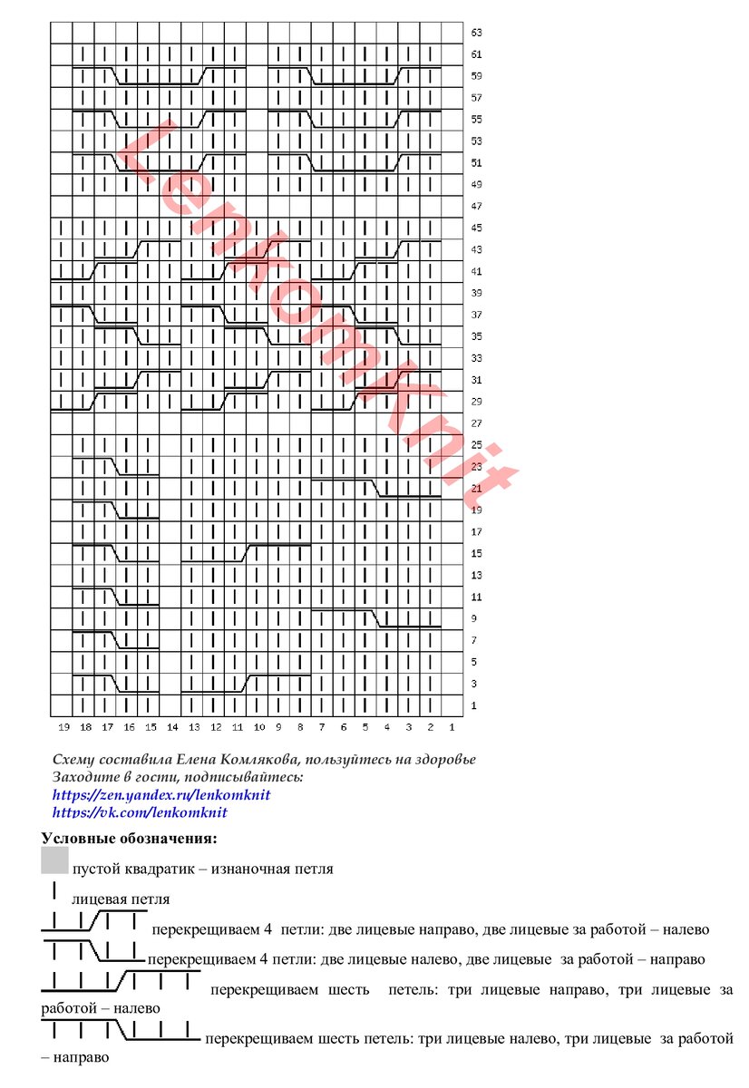 На схеме нарисованы последовательно все узоры левой полочки. А правая полочка вяжется полностью узором из кос, который на схеме с 49 по 52 ряд.