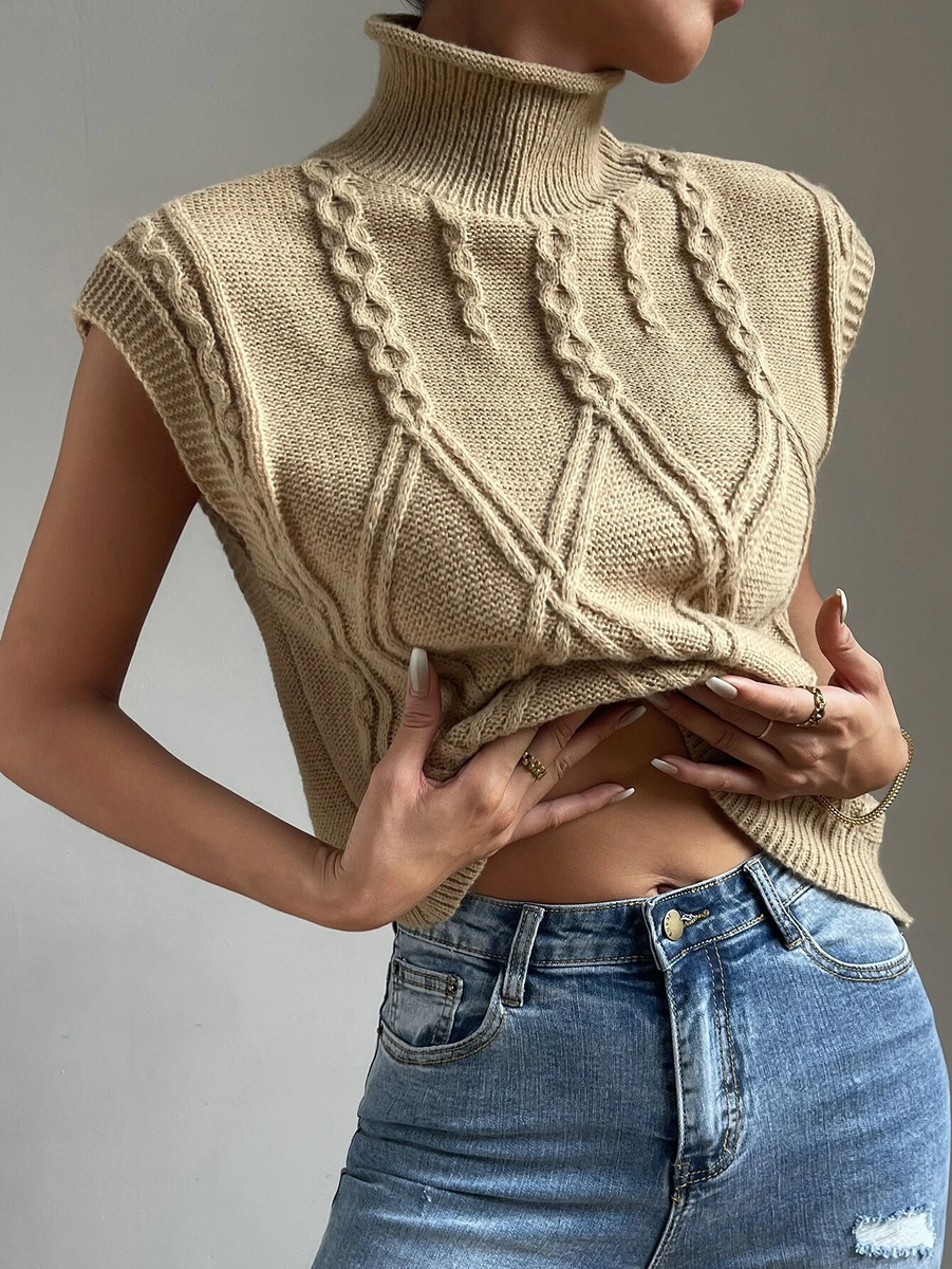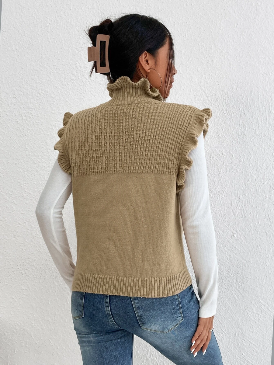 У этой безрукавки интересный высокий ворот-гольф. Он связан резинкой 1х1, а заканчивается руликом.