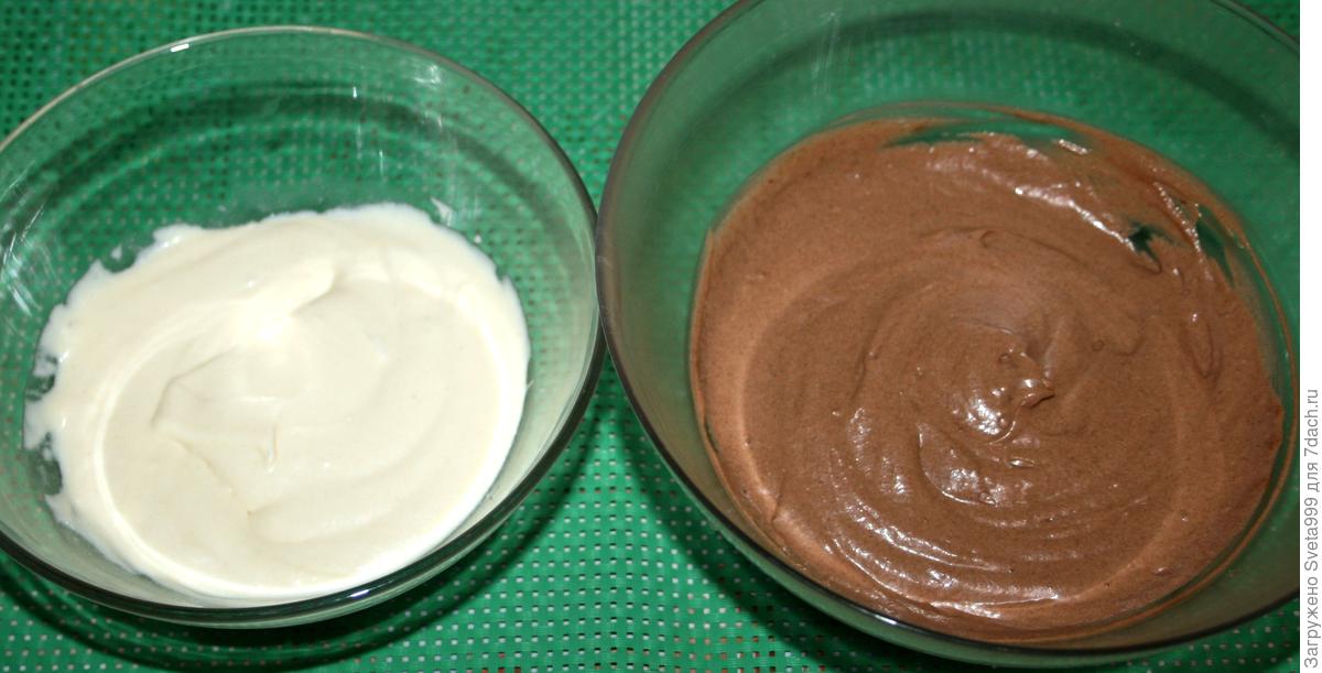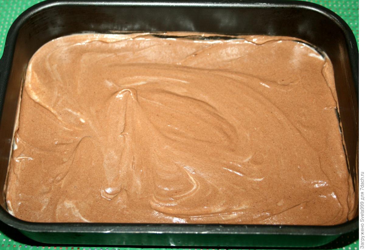 На светлое тесто выкладываем темное и разравниваем по форме.