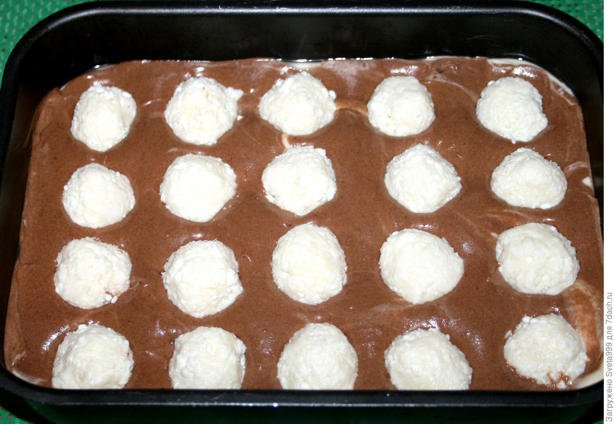 Затем на тесто кладем ранее подготовленные творожно-кокосовые шарики, нажимаем на них, так, чтобы шарики погрузились в тесто наполовину. Выпекаем пирог в духовке при температуре +180°С 40-45 минут.