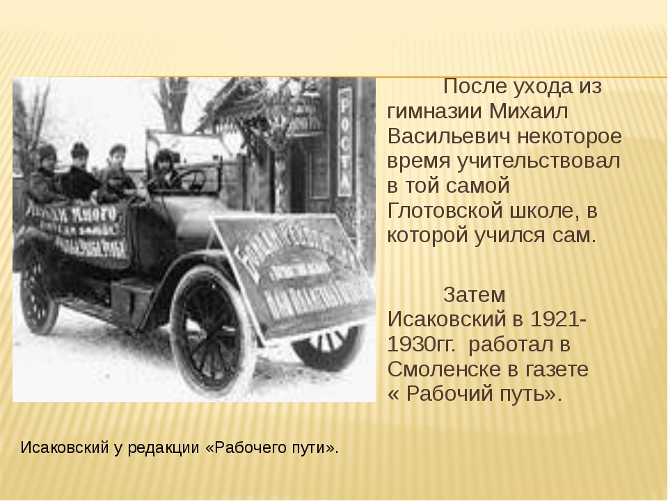 А весной 1921 года в редакции появился новый сотрудник - Миша Исаковский. Михаил Васильевич работал в «Рабочем пути» на разных должностях - был секретарем, инструктором рабкоровского движения, ночным редактором, заведующим литературным отделом... К нему шли жители далеких деревень - целыми днями в «Рабочий путь» «за правдой» тянулись женщины с грудными детьми и крестьяне, одетые в рваные зипуны и изношенные лапти. Он выслушивал каждого, давал советы и помогал - хлопотал, звонил, писал письма во все инстанции, хотя это в его обязанности не входило.