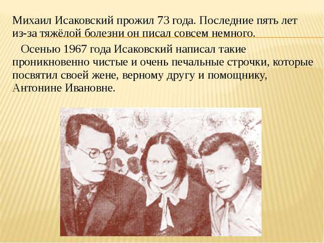 Песни Исаковского действительно пели все. «Знаешь, Лена, - писал он при этом дочери в марте 1947 года, - мне иногда бывает так трудно, что и выразить нельзя. Многие почему-то считают, что я все могу, что для меня все открыто. Поэтому и родственники и не родственники, и знакомые и незнакомые считают своим долгом обратиться ко мне. Все просят той или иной помощи. И я даже понимаю это - потому что время сейчас трудное, но все же никому не приходит в голову, что, может быть, мне и самому трудно. Это никого не интересует, и это бывает обидно. А у меня действительно много огорчений и забот. Я дошел до такого состояния, что работать уже не могу, работаю очень мало. Всю зиму тяжело больна Лидия Ивановна (жена). Пришел из армии мой старший брат Нил, которому некуда деваться (дом его разрушен немцами, жена убита). А мне его тоже девать некуда. В то же время и махнуть на него рукой нельзя. Надо что-то предпринимать. Таких и им подобных вещей очень много, чересчур уж много. Я пишу тебе об этом потому, что, как говорится, очень уж наболело и хочется высказаться. Но ты ни в коем случае не принимай это на свой счет. Ты - это совсем особое дело, ты моя дочка...»