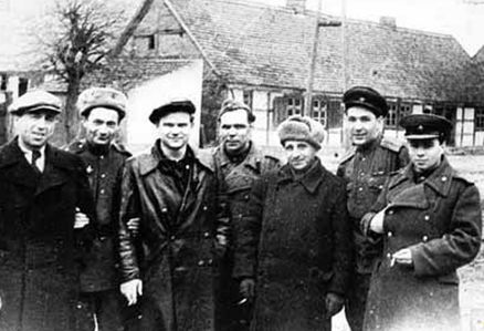 Композитор М. Блантер, поэт М. Светлов, композитор Т. Хренников, редактор корпусной газеты М. Козловский и др. (слева направо) в освобожденной советскими войсками Польше