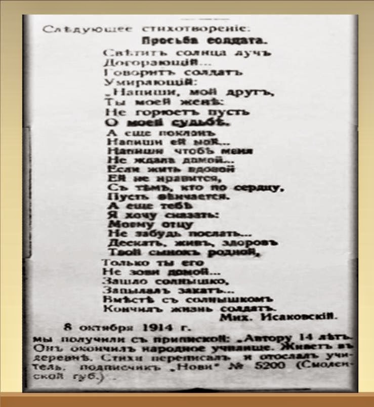 В 1927 году вышла в Москве книга стихов Исаковского «Провода в соломе». Книгу незамедлительно подверг разгрому известный критик А. Лежнев, однако за молодого поэта вступился М. Горький. «Михаил Исаковский, - написал он, - не деревенский, а тот новый человек, который знает, что город и деревня - две силы, которые отдельно одна от другой существовать не могут, и знает, что для них пришла пора слиться в одну необоримую творческую силу...»