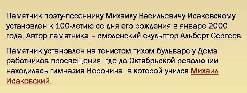 М.В. Исаковский - Русский советский поэт. Герой Социалистического Труда (1970). Лауреат двух Сталинских премий первой степени (1943, 1949), родился в деревне Глотовка Ельнинского уезда. «В деревнях и селах этого района издавна жили люди, наделенные богатыми голосовыми данными, - писал Твардовский в статье, посвященной своему старшему другу. - Достаточно сказать, что известный Хор имени Пятницкого включает в себя до десяти человек выходцев из деревни Глотовка Всходского района. А участники Бабыковского колхозного хора, как говорят, - потомки крепостного хора крестьян. Песенное мастерство передавалось из поколения в поколение. Здесь, в одном из глухих и отдаленных углов нашей области, эти поколения сохранили и пронесли через десятилетия слова и мелодии старинных народных песен...»