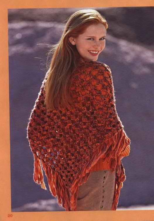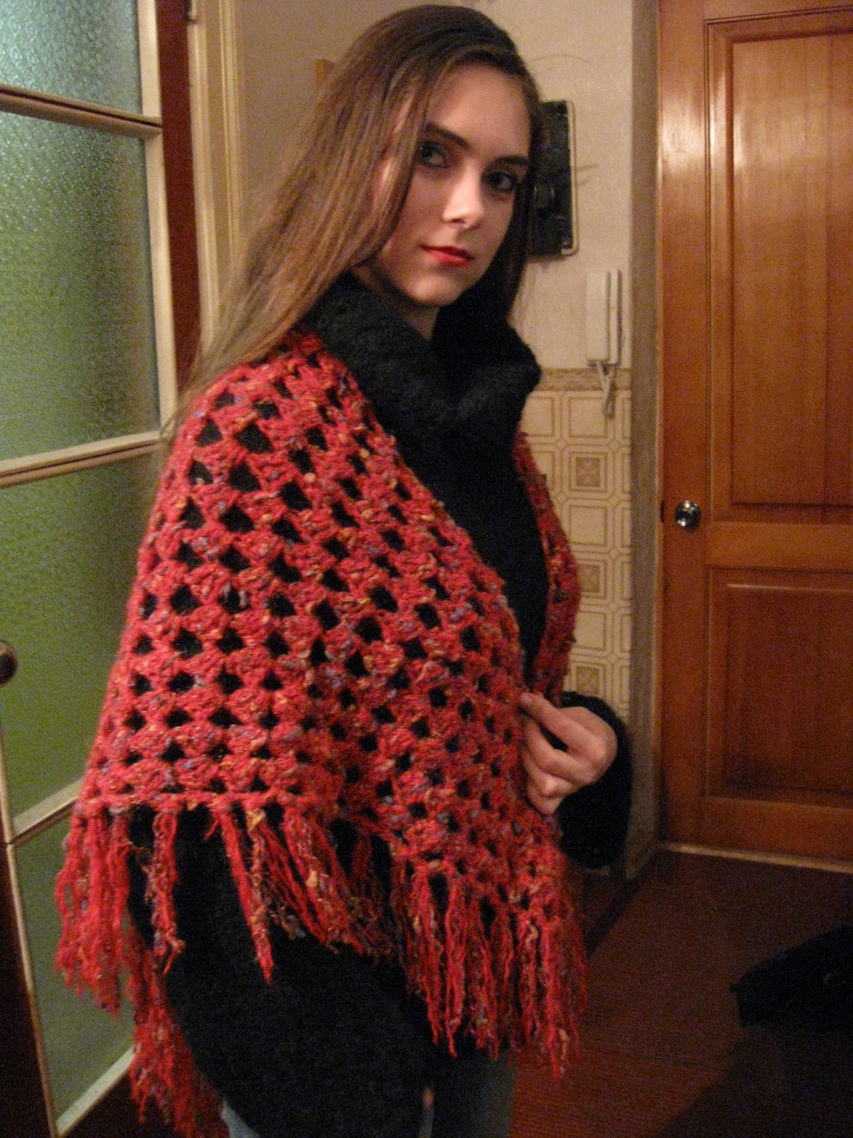 Эта шаль-платок былы позаимствована из журнала ( Маленькая Диана" №8 2008 ) связана из фантазийной буклированной пряжи + тонкая красная мохеровая нить.