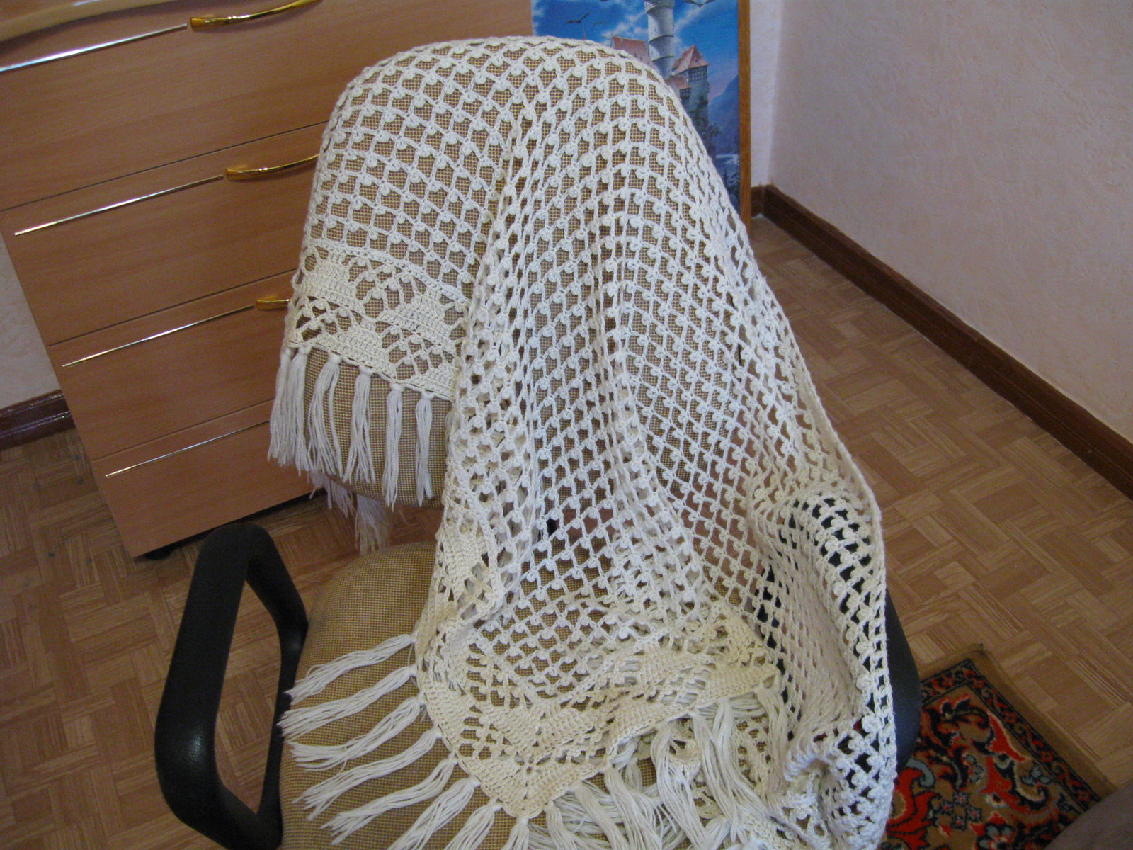 А это самая первая шаль. Вязала из шерсти с козьим пухом. Козий пух повылез со временем, но шаль до сих пор одна из самых любимых.