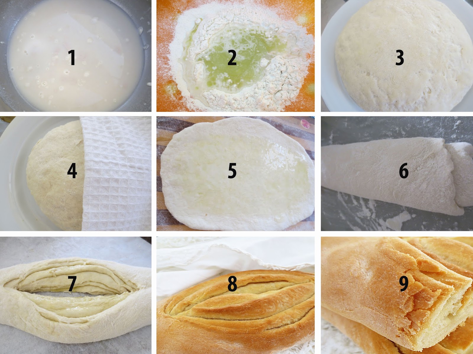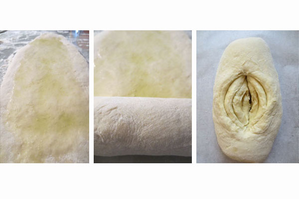 7.Лезвием делаем надрез ( как показано на фото) отступая от краев по 5- 8 см.Смазать разрез оливковым маслом. Противень застилаем бумагой для выпечки, выкладываем тесто. Оставляем отдохнуть тесто на 1 час.
