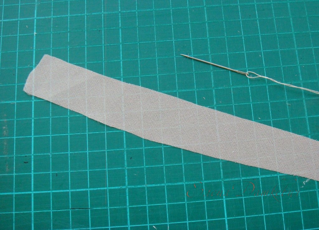 Ткань я режу по косой, чтобы она сильно не мохрилась. Ширина полоски примерно 2-3 см, длина 20-30см.