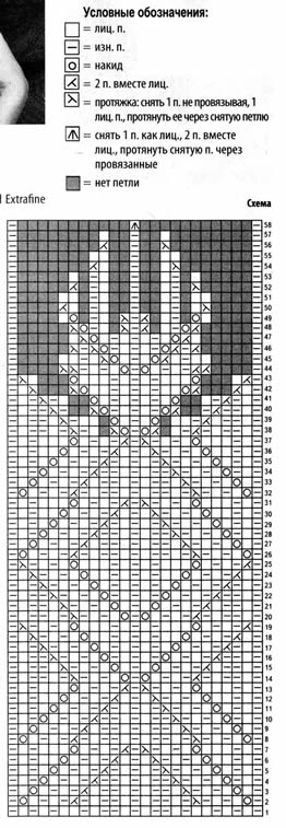 Ряд прибавлений 2: *1 лиц. п., [1 изн. п., 1 лиц. п.] 2 раза, прибавьте 1 п., [1 изн. п., 1 лиц. п., 2 изн. п., 1 лиц. п.] 2 раза, 1 изн. п., прибавьте 1 п., [1 лиц. п., 1 изн. п.] 3 раза; повторяйте от * по кругу = 192 п. Перейдите на спицы №2,5 и продолжите вязание по схеме,повторяя по кругу раппорт из 24 п. 8 раз. По окончании 58 рядов обрежьте нить, оставив «хвостик» длиной 20,5 см. Протяните нить через 16 оставшихся петель, стяните их.