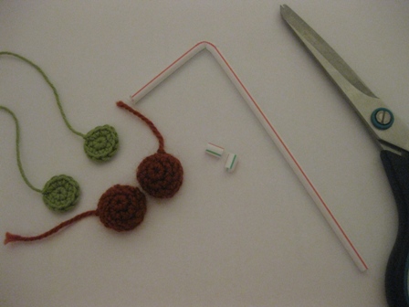 Из наших ботинок торчат худенькие ножки. Чтобы эти ножки присоединить к ботинкам, берем трубочку от сока, отрезаем от нее два маленьких кусочка.