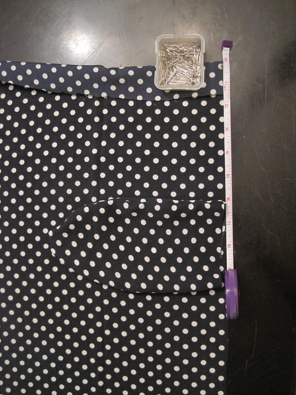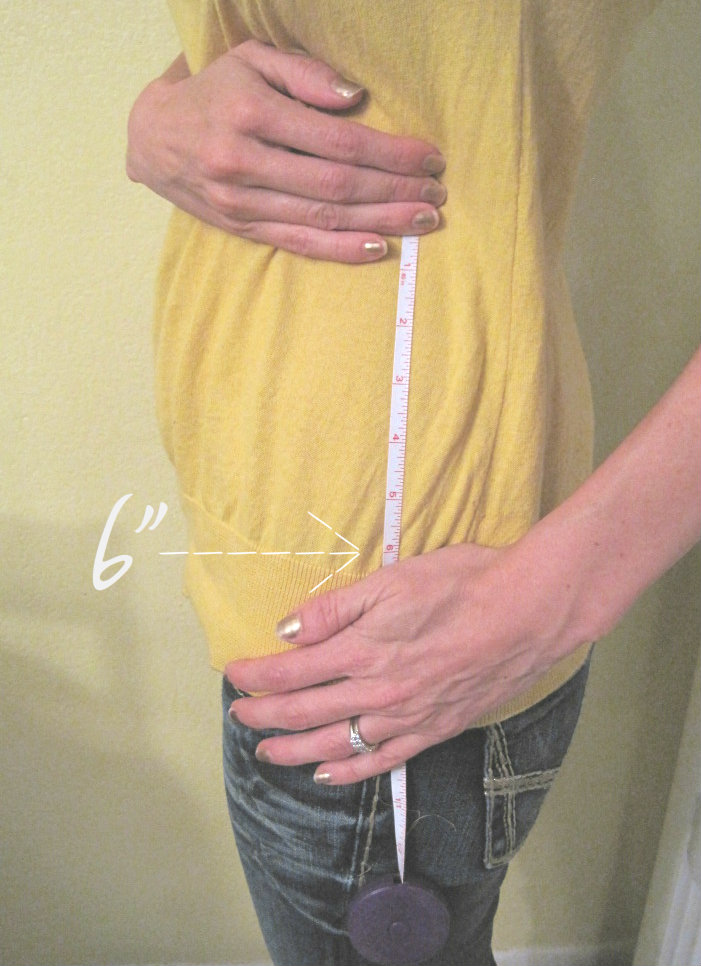 Измерьте растояние от вершины (пояса) до того, где вы хотите, что бы на юбке начаниласи карманы. Я сделала 6" в низ от верха, до начала карманов.
