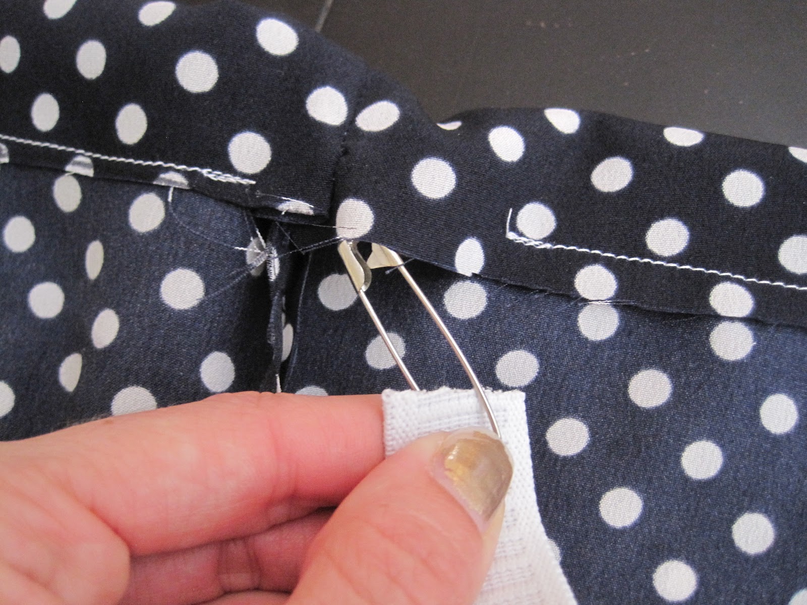 Наконецто подшить дно юбки, завернув край один или два раза. Прикалываем булавочками и строчим.