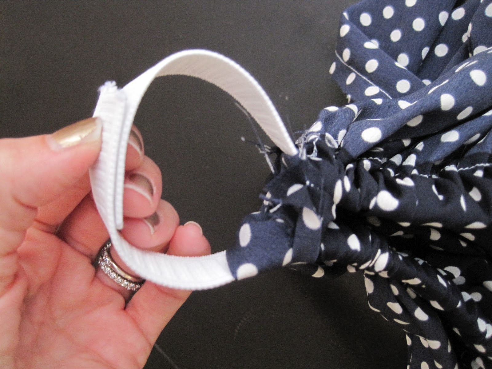 Вытянуть два конца наружу и слошить их внахлёст, прошить их строчкой. Теперь вставляем её наместо, равномерно распредиляя ткань по всей резинке. Зашить отверстие.