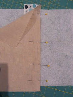 Положите флизелиновый прямоугольник клейкой стороной кверху и отметьте на нем середину длинной стороны. Теперь отступите от левого края 10 см и проутюжьте разноцветный прямоугольник. Помните, что флизелин у вас лежит лицевой стороной кверху, поэтому утюг должен касаться лишь полоски разноцветной ткани!