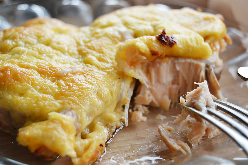 5. В духовке температуру убавить до 180°C и выпекать рыбу около 30-40 минут, пока сыр не зарумяниться. А еще лучше готовность проверять вилочкой.