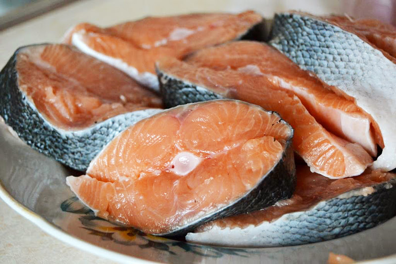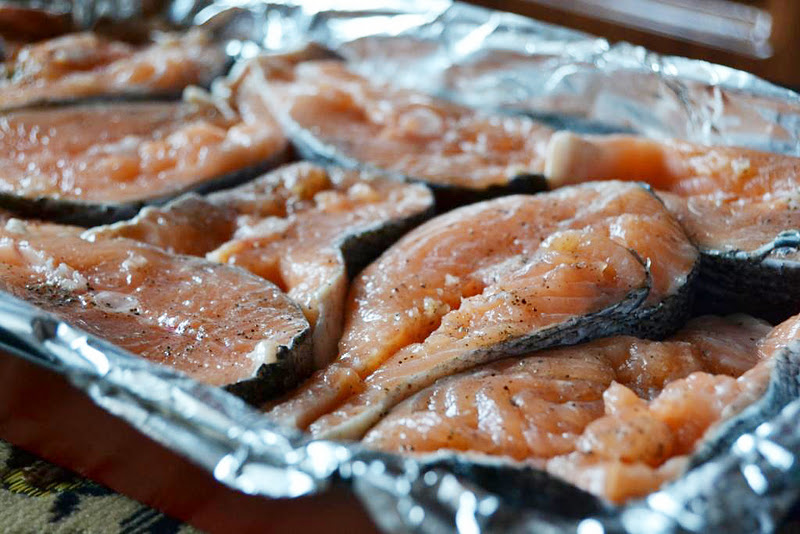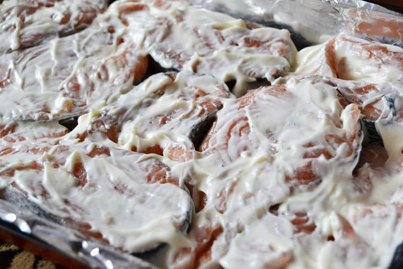1. Горбушу мы покупали уже выпотрошеную, так что маме осталось только избавить её от головы :D. Потом рыбу нарезать на стейки, толщиной около 1,5-2 см. Посолить и померчить с обеих сторон каждого кусочка.