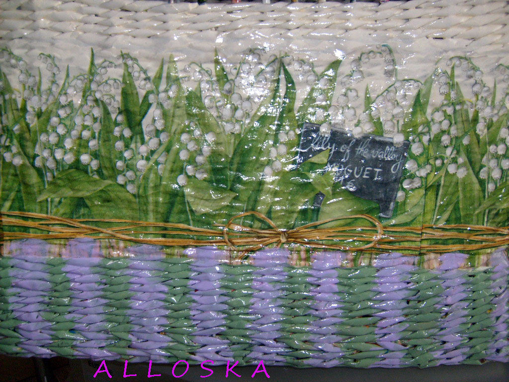 Сначала сделала декупаж с помощью файла,потом оформила низ корзина акриловой краской,зеленого и сиреневого цвета, а также покрасила в тон салфетки расстояние от ландышей до окошек.
