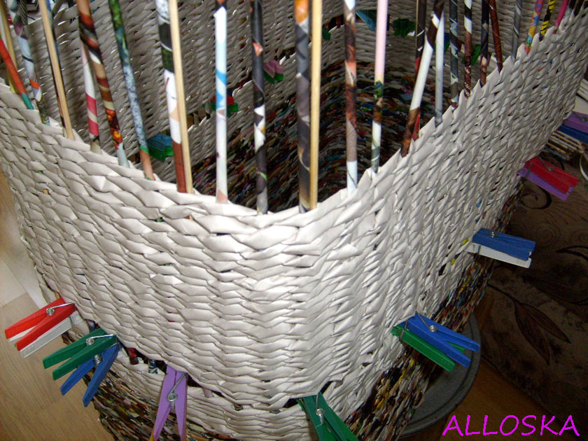 чтобы сделать окошки в плетении на одном уровне,крепила подряд 2 прищепки.получилось почти ровно.