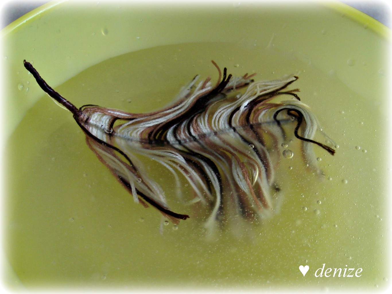 5. Теперь в полученном "киселе" интенсивно купаем наше перышко, чтоб ниточки хорошенько промокли.