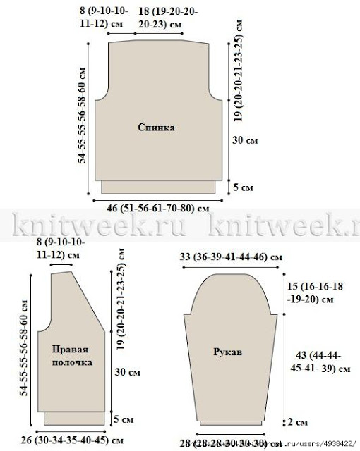 Через 44.5 (45.5-45.5-47-43-40.5) см начать формирование оката рукава: закрыть в начале след. 2-х рядов 5 (5-5-6-8-9) п. и далее делать убавки по 1 п. с каждой стороны в каждом лиц.р. пока на спицах будет 43 (53-63-67-61-61) п., потом в каждом ряду пока на спицах будет 13 (13-15-15-17-17) п. Закрыть петли.