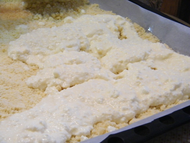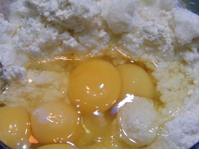 Творог, яйца и 12 столовых ложек сахара смешать и поставить массу в холодильник.