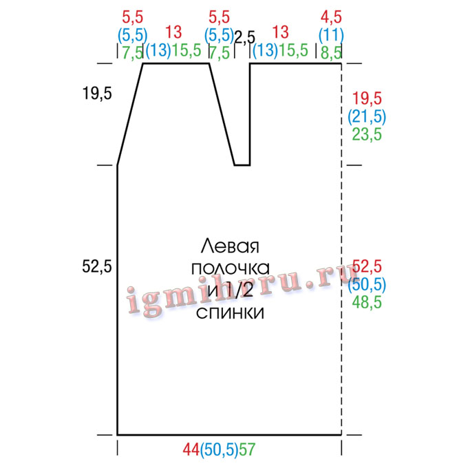 Сначала продолжить вязать спинку, при этом в 1-м ряду для проймы с обеих сторон оставить непровязанными по 3 петли. Через 72 см от начального ряда работу закончить. Далее на последних 4 (4) 5 раппортах + 1 конечной петле продолжить вязать левую полочку, при этом в 1-м ряду для проймы с правого рабочего края оставить не провязанными 3 петли.