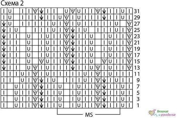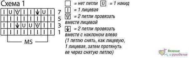Число петель кратно 6 + 2 + 2 кромочные = вязать согл. схеме 1. На ней даны лицевые ряды. В изнаночных рядах все петли и накиды провязывать изнаночными, из 2 накидов подряд 1-й накид провязывать изнаночной, 2-й накид – изнаночной скрещенной. Начать с 1 кромочной и петли перед раппортом, раппорт постоянно повторять, закончить петлей после раппорта и 1 кромочной. Постоянно повторять 1–8-й ряды.
