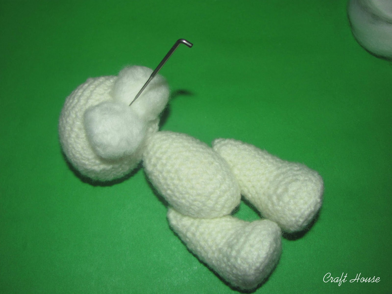 Голову набиваем плотно, но не переусердствуйте) во-первых потеряет форму, т.к. полотно эластичное, во-вторых будет перевешивать и игрушка не будет стоять. После обрезания нитки, крючок вводим сбоку и вытаскиваем кончик нитки, теперь можно обрезать.