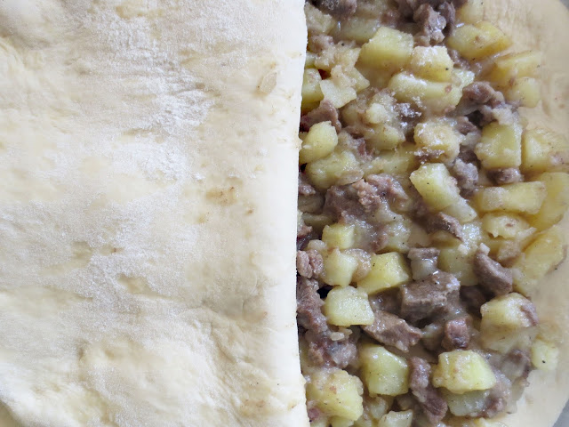 Из каждой части раскатать овальную лепешку. На нижнюю лепешку положить начинку, накрыть верхней лепешкой, залепить концы