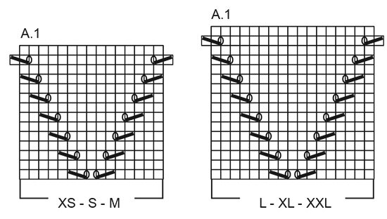 Для РЕГЛАНА прибавлено по 1 петле с каждой стороны маркерной нити - читайте объяснение выше. Прибавлять таким образом для реглана через ряд 15-17-19-20-22-23 раза всего = 176-192-208-224-240-248 п. ПОМНИТЕ о плотности ВЯЗАНИЯ! В ТО ЖЕ ВРЕМЯ, когда А.1 будет провязан в вертикальном направлении, начните новый повтор в вертикальном направлении и продолжайте уже начатые ряды глазков в каждую сторону. Когда все прибавления сделаны, длина изделия составит ок. 20-23-25-27-29-31 см от маркера. Продолжать вязать (без дополнительных прибавок для реглана) до высоты 23-23-25-27-29-31 см от маркера. В ТО ЖЕ ВРЕМЯ, когда А.1 будет провязан в вертикальном направлении, начните новый повтор в вертикальном направлении и продолжайте уже начатые ряды глазков в каждую сторону. Когда все прибавления сделаны, длина изделия составит ок. 20-23-25-27-29-31 см от маркера. Продолжать вязать (без дополнительных прибавок для реглана) до высоты 23-23-25-27-29-31 см от маркера. В ТО ЖЕ ВРЕМЯ, когда А.1 будет провязан в вертикальном направлении, начните новый повтор в вертикальном направлении и продолжайте уже начатые ряды глазков в каждую сторону. Когда все прибавления сделаны, длина изделия составит ок. 20-23-25-27-29-31 см от маркера. Продолжать вязать (без дополнительных прибавок для реглана) до высоты 23-23-25-27-29-31 см от маркера.