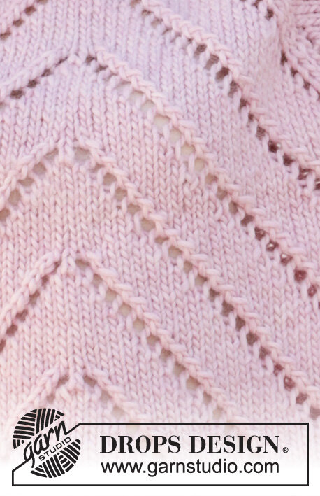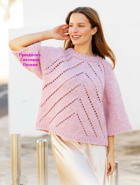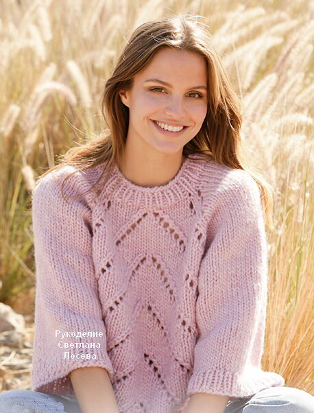 = 104-112-124-132-140-148 ст. Начинайте по кругу после середины 5-5-5-7-7-7 новых петель, набранных под рукавом с одной стороны. Провяжите лицевой гладью 5-5-5-7-7-7 новых петель, набранных с каждой стороны под рукавом. Продолжайте вязать ажурным узором (A.1), как и раньше, над оставшимися петлями. То есть, когда А.1 будет провязана вертикально, начните новый повтор вертикально и продолжайте смещать ряды петелек в каждую сторону, пока 5-5-5-7-7-7 петель не останется лицевой гладью с каждой стороны. Когда длина детали составит 18-20-20-20-20-20 см, не начинайте больше повторений А.1 по вертикали, а вяжите лицевой гладью как до и продолжайте смещать уже начатые ряды петелек в каждую сторону. При размере изделия 23-25-25-25-25-25 см равномерно прибавить 20-22-24-26-28-30 п = 124-134-148-158-168-178 п. Перейдите на круговые спицы № 7 мм. Вязать резинкой (1 лицевая/1 изнаночная) по кругу на протяжении 4 см. Закройте петли лицевыми над лицевыми и изнаночными над изнаночными — читайте СОВЕТ ПО ЗАКРЫТИЯМ. Размеры свитера ок. 54-56-58-60-62-64 см.