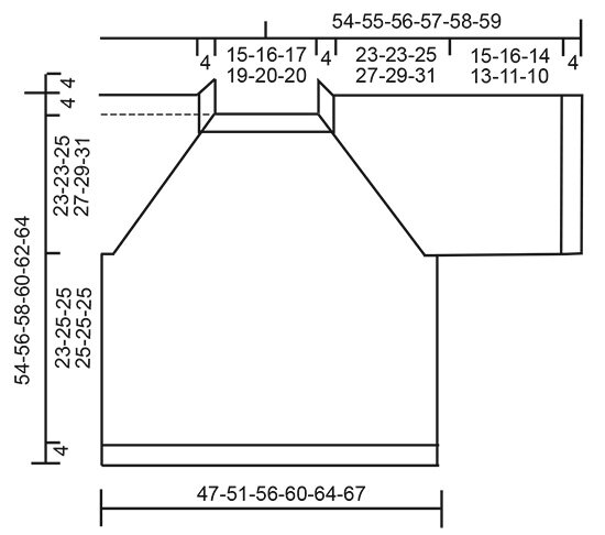Провяжите как раньше первые 47-51-56-59-63-66 п. (= спинка), следующие 41-45-47-53-57-57 п. снять на петледержатель (= рукав), набрать на спице 5-5-5-7-7-7 новых п. (= сбоку под рукавом), провяжите следующие 47-51-57-59-63-67 п. (= передняя часть), снять следующие 41 п. -45-47-53-57-57 п на держателе петель (= рукав), набрать 5-5-5-7-7-7 новых п на спицу (= сбоку под рукавом). В размерах M и XXL вяжите последнюю петлю по кругу (т.е. эти петли относятся к спинке = 47-51-57-59-63-67 пет спинки). Обрежьте пряжу.