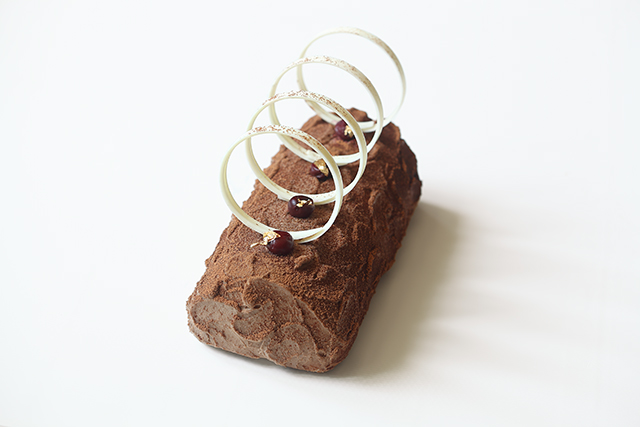 7) Замороженный торт достать из формы. Можно дать ему слегка оттаять и лишь затем при помощи маленькой спатулы хаотичными крупными мазками нанести каштановый крем по всей поверхности торта. Сверху присыпать какао. Украсить шоколадными элементами, вишней и кусочками пищевого золота.