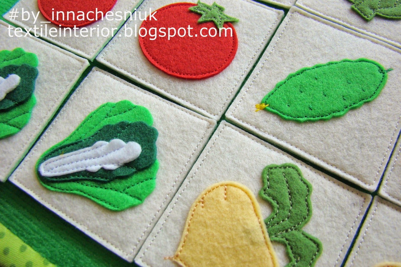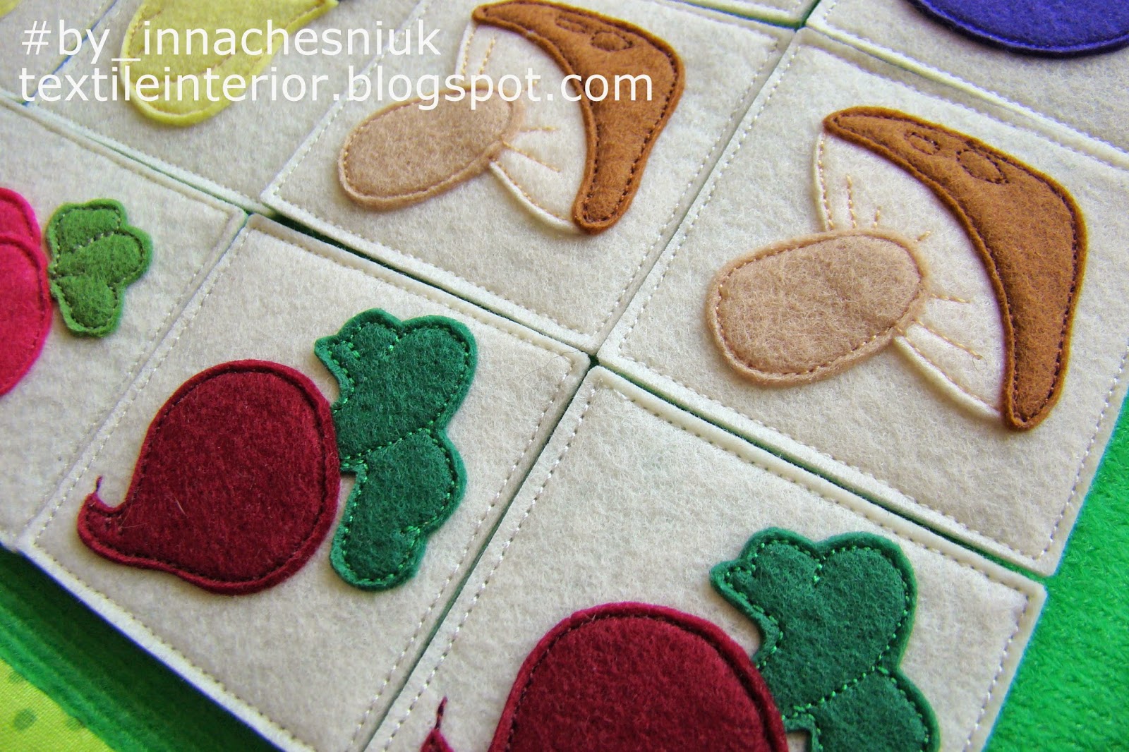Карточки размером 5/5 см, из плотного листового фетра с аппликацией, с обратной стороны каждой - кусочек велкро. Особое внимание при пошиве и эскизировке уделяла эстетической подаче аппликаций, как результат - тщательная прорисовка и максимальное сходство с оригиналом на грядке и в саду ;)