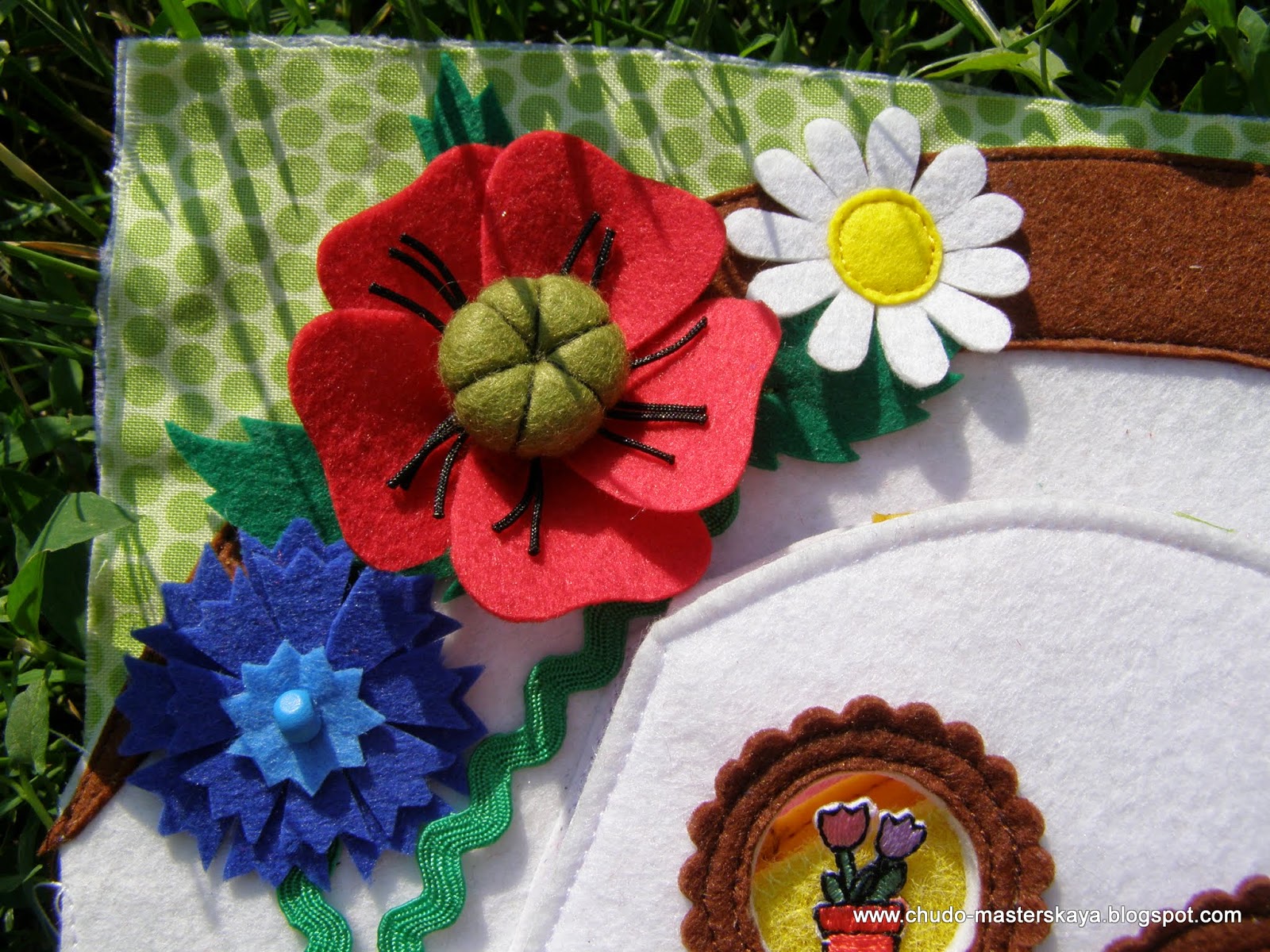 Вокруг домика Мухи растут красивые полевые цветы из фетра: ромашка, василек, мак, колокольчики, а также травы из репсовых ленточек.