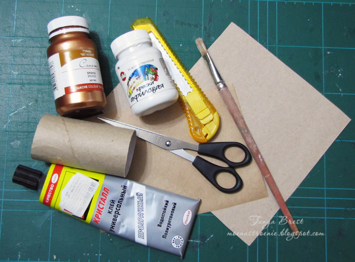Итак, поехали) Нам понадобится: картонная трубка картон клей (я использовала момент кристалл) кусочек крафт-бумаги, или любой другой ножницы краска акриловая и гуашь кисточка нож, коврик