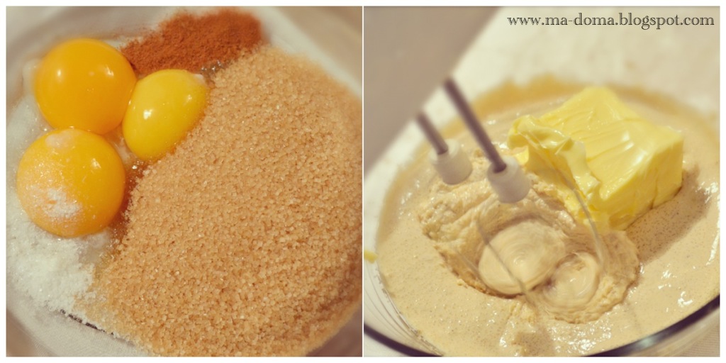 В отдельной миске смешайте 3 желтка, сахар, в т.ч. ванильный, щепотку соли и молотую корицу. Ингредиенты взбейте миксером до однородности, затем добавьте размягченное сливочное масло. И еще раз все хорошо перемешайте.